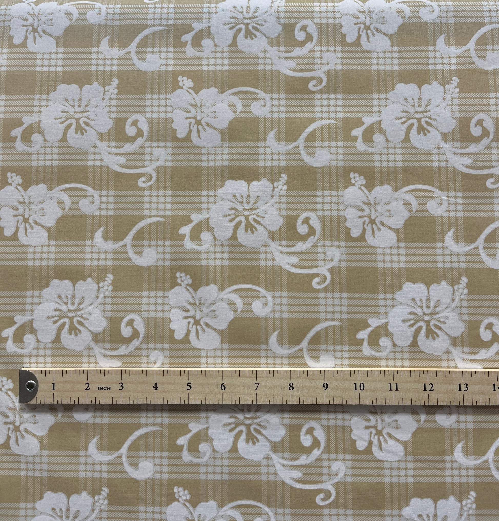 Cotton palaka fabric featuring an elegant hibiscus flower pattern throughout. This traditional Hawaiian-inspired textile combines the classic palaka check design with vibrant hibiscus motifs, perfect for authentic island-themed garments, home décor, or craft projects requiring premium cotton construction.